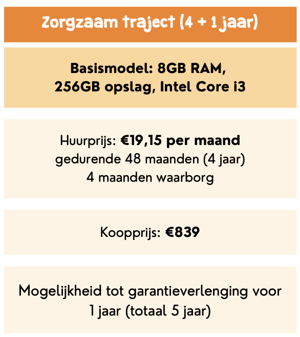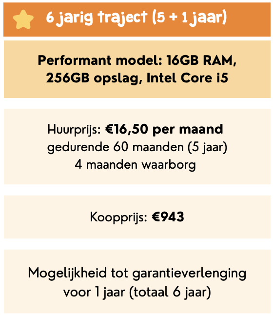 Wie zes jaar met hetzelfde toestel school loopt waarvan het laatste jaar zonder garantie. of voor leerlingen die na vier schooljaren eventueel een nieuw of krachtiger toestel willen aanschaffen.